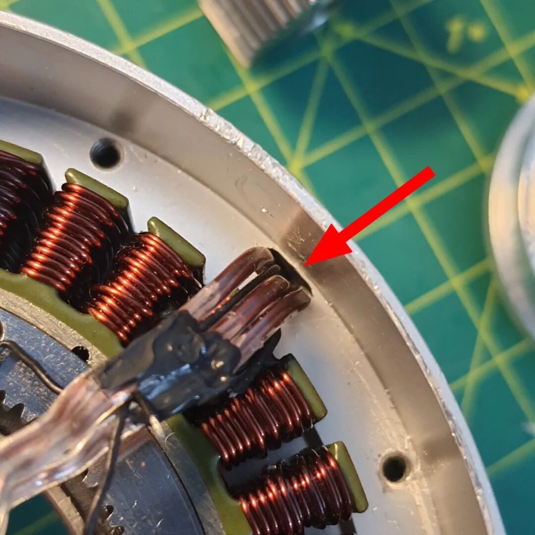 电机的顶壳超级难拆,没有任何能抓到固定的地方,也很锋利,只能用绳子小心拽开,以免损坏零件。撬开前要先弄开碳纤维板,以免损坏里面的线路。
