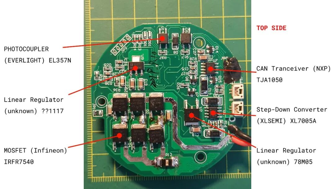 正面有两个光耦,两个个LDO,6个MOS,一个DCDC,还有一个CAN转换器,用于动作的同步。