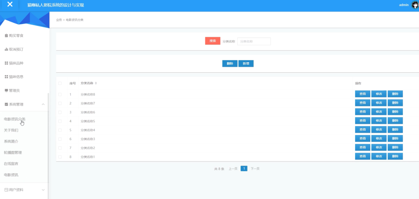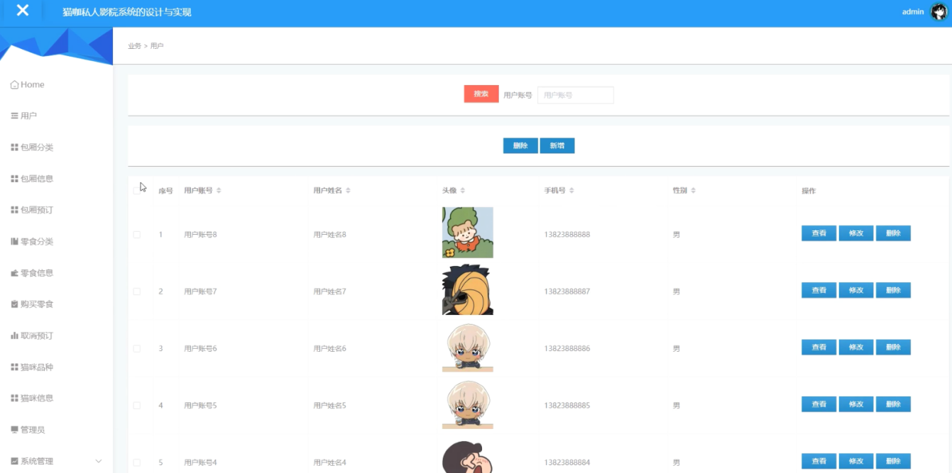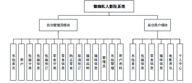 课题主要分为二大模块:即管理员模块和用户模块,主要功能包括:个人信息修改、用户信息、包厢信息、零食信息、猫咪信息、电影资讯等;