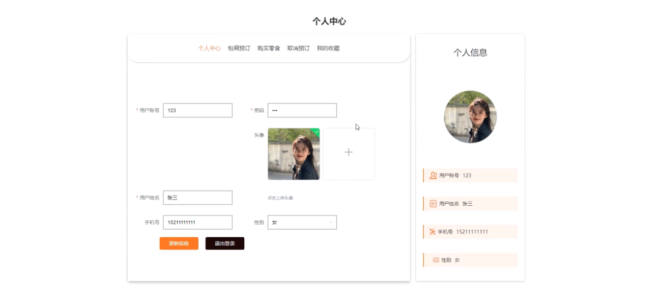 用户点击个人中心,在个人中心页面可以更新个人详细信息,还可以对包厢预订、购买零食、取消预订、我的收藏进行详细操作;如图5-6所示: