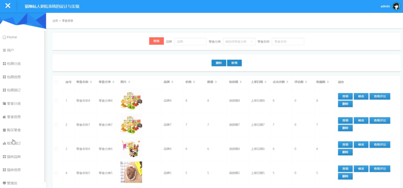 The project is mainly divided into two modules: the administrator module and the user module. The main functions include: personal information modification, user information, box information, snack information, cat information, movie information, etc;