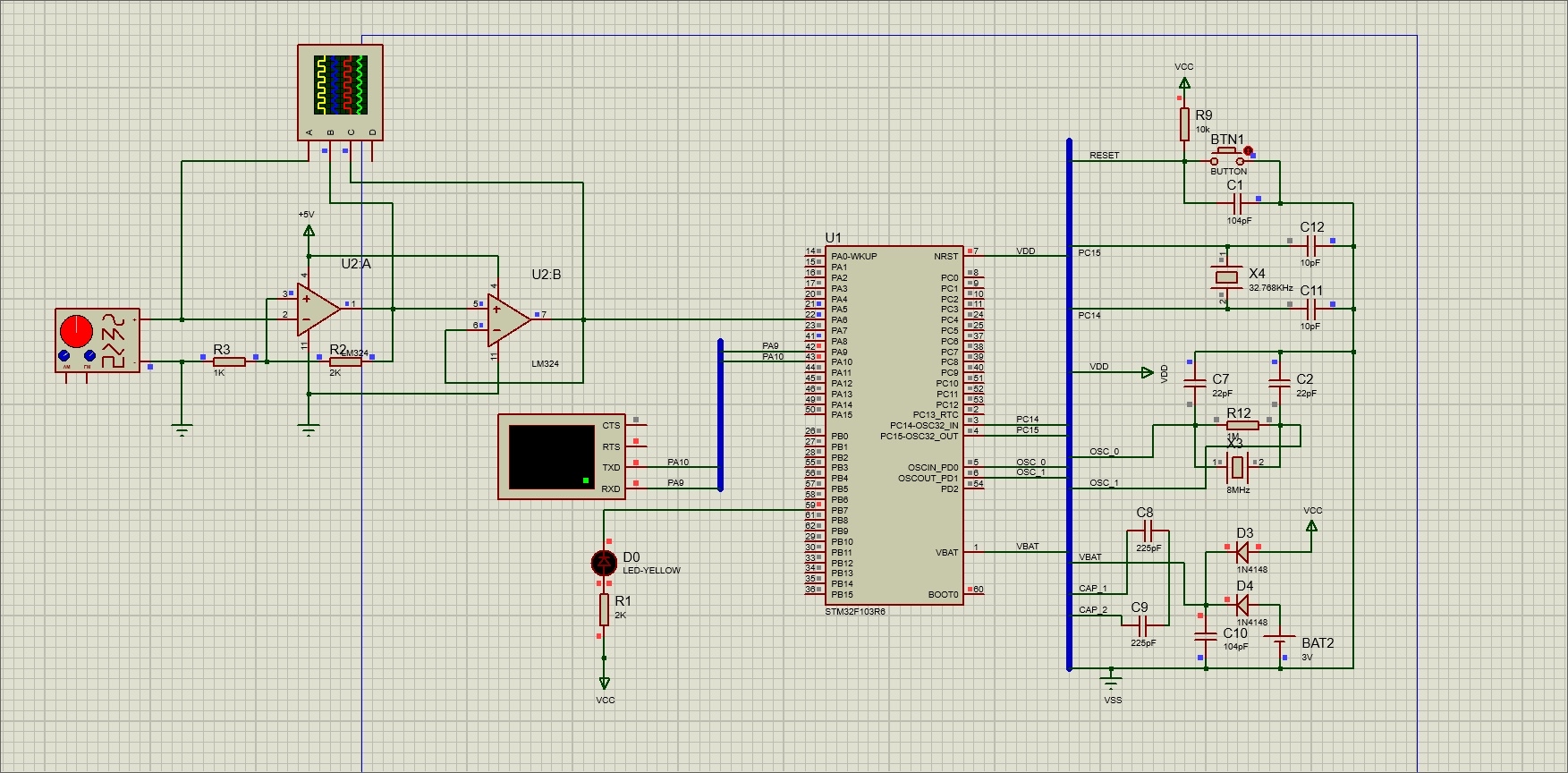 基于stm32简易测频计 有报告 使用 Proteus 仿真32单片机,实现了可以测量正弦波、方波、正弦波和锯齿波等波形频率的 频率计,测量误差在1%以内