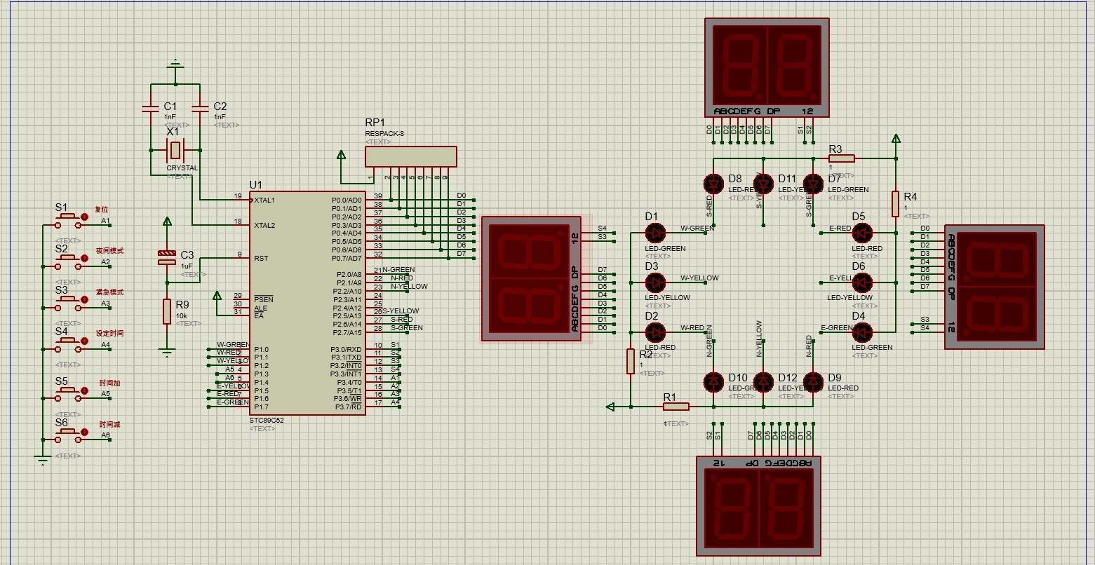 基于51单片机交通灯设计 单片机模拟交通灯 信号灯 十字路口信号灯51单片机交通灯proteus仿真 仿真图protues 8.0 程序编译器:keil 4/keil 5 程序 仿真 原理图 报告 功能如下: 1.红绿灯时间可显示,正常红绿灯切换 2.可以按键设置红绿灯时间 3.有交通管制按键(按下默认全部红灯)