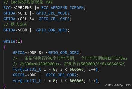 由于一条语句执行约6个时钟周期,故循环666666次则可得到比较精准的500ms,以此可实现简易的LED闪烁。