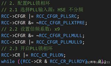(2)配置PLL锁相环参数:HSE、9倍频,并启动