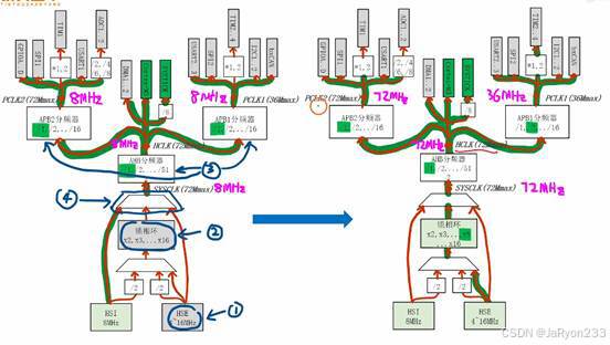 HSE->锁相环->AHB->APB1(/1) APB2(/2)