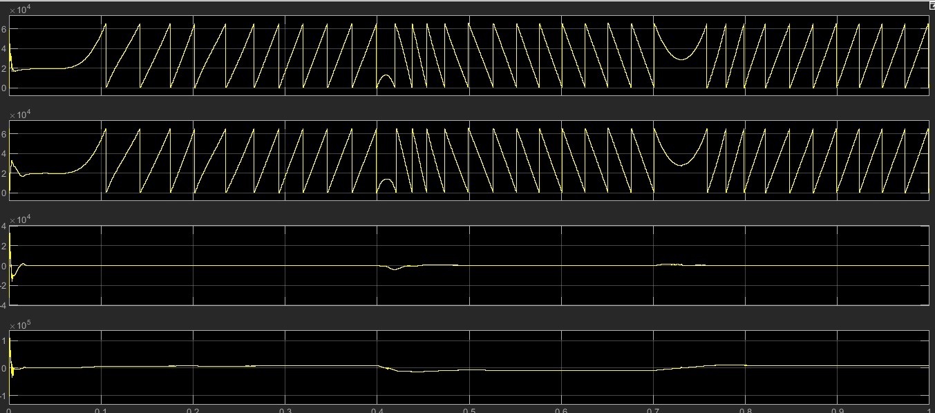 更为贴近mcu实际代码,且更容易在低端mcu中实现,如ARM-M0核,仿真中测试加入了阶跃信号,波形见下图,仿真并没有很详细调节参数。更为贴近mcu实际代码,且更容易在低端mcu中实现,如ARM-M0核,仿真中测试加入了阶跃信号,波形见下图,仿真并没有很详细调节参数。注意实际单片机里直接用整数运算,连除法都不用做。不同于其它模型,此模型为标幺值模型,所有环节均为整型标幺化离散模型,三角函数计算采用