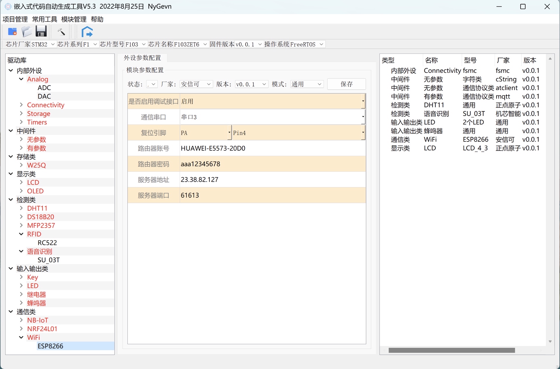 STM32 单片机 代码自动生成工具 mqtt 一、说明 嵌入式低代码开发工具是针对STM32F103单片机学习成本高、底层代码设计重复繁琐、移植和使用不方便、以及Keil5开发收费等问题而开发,通过代码自动生成技术根据用户需求完成单片机底层代码的自动生成,并提供了一些常用的模块和组件。 同时本工具还提供了Keil5和gcc两种开发方式,针对keil5存在版权问题,还可以使用基于vscode和gcc进行单片机的开发。 二、提供的源代码 提供STM32F103系列3款单片机20余种外设和传感器底层驱动,包括MCUFLASH、串口框架、IO框架、Debug框架、ADC、DAC、定时器、SPI、fmsc、MQTT、cstr字符处理、AT指令框架、ESP8266、NB模块AIR302、24L01无线模块、DHT11温湿度、0.96寸OLED、0.91寸OLED、中景园电子1.8寸LCD、正点原子4.3寸LCD、按键、LED、蜂鸣器、继电器、W25Q、DS18B20、RFID RC522模块、语音识别SU-03T等众多模块的源代码。 APP工程的软件设计采用高内聚低耦合的模块化设计框架,可实现面向对象的软件开发。 主要代码提供了较为详细的注释,方便用户理解相应的程序实现逻辑。 三、项目特点 1.核心板为BTB可拆卸式设计,方便更换芯片型号; 2.核心板板载下载电路和串口电路,无需外接下载器和串口工具; 3.底板板载多种常用传感器和接口; 4.配套嵌入式代码自动生成工具,方便开发者开发; 5.代码自动生成工具提供Keil5和gcc两种开发方式。