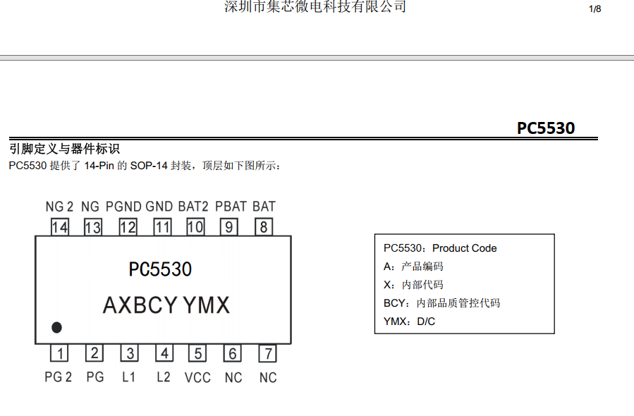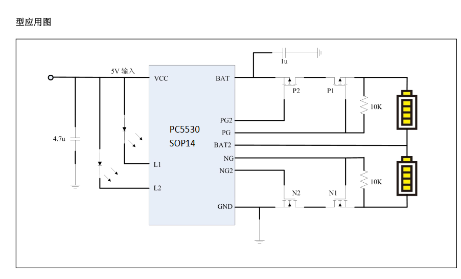 PC5530是一款完整的双节锂离子电池充电器, 带电池正负极反接保护,采用恒定电压线性控制。只需较少的外部元件数目使得PC5530便携式应用的理想选择。 PC5530可以适合 USB电源和适配器电源工作。由于采用了内部 PMOSFET 架构,加上防倒充电路,所以不需要外部检测电阻器和隔离二极管。热反馈可对充电电流进行自动调节,以便在大功率操作或高环境温度条件下对芯片温度加以限制。充满电压固定于 4.25V,内部预设 1A 充电电流。当电池达到 4.25V 之后,充电电流定值 1/10,PC5530将自动终止充电。当输入电压(交流适配器或 USB 电源)被拿掉时,PC5530 动进入一个低电流状态,电池漏电流在 3uA 以下。 PC5530的其他特点包括充电电流监控器、欠压闭锁、自动再充电和两个用于指示充电结束和输入电压接入的状态引脚。