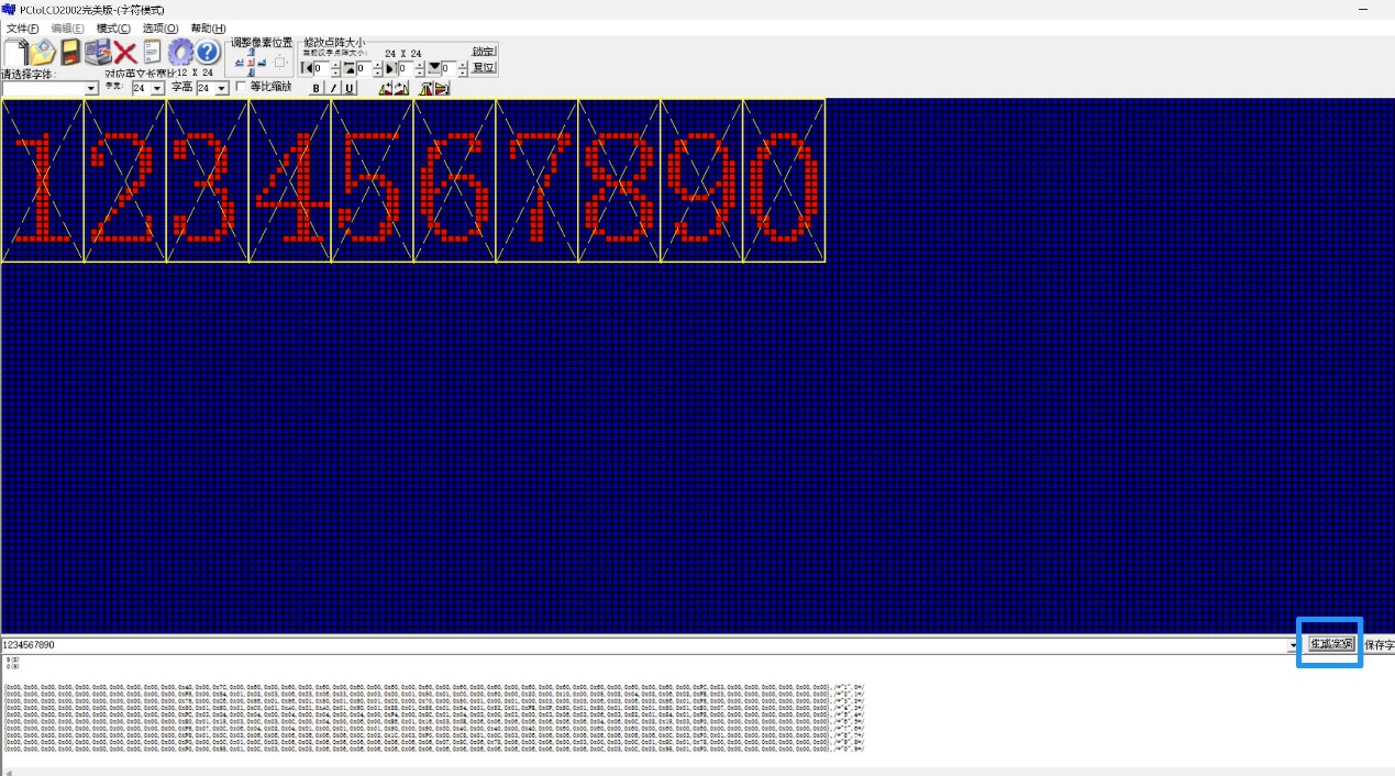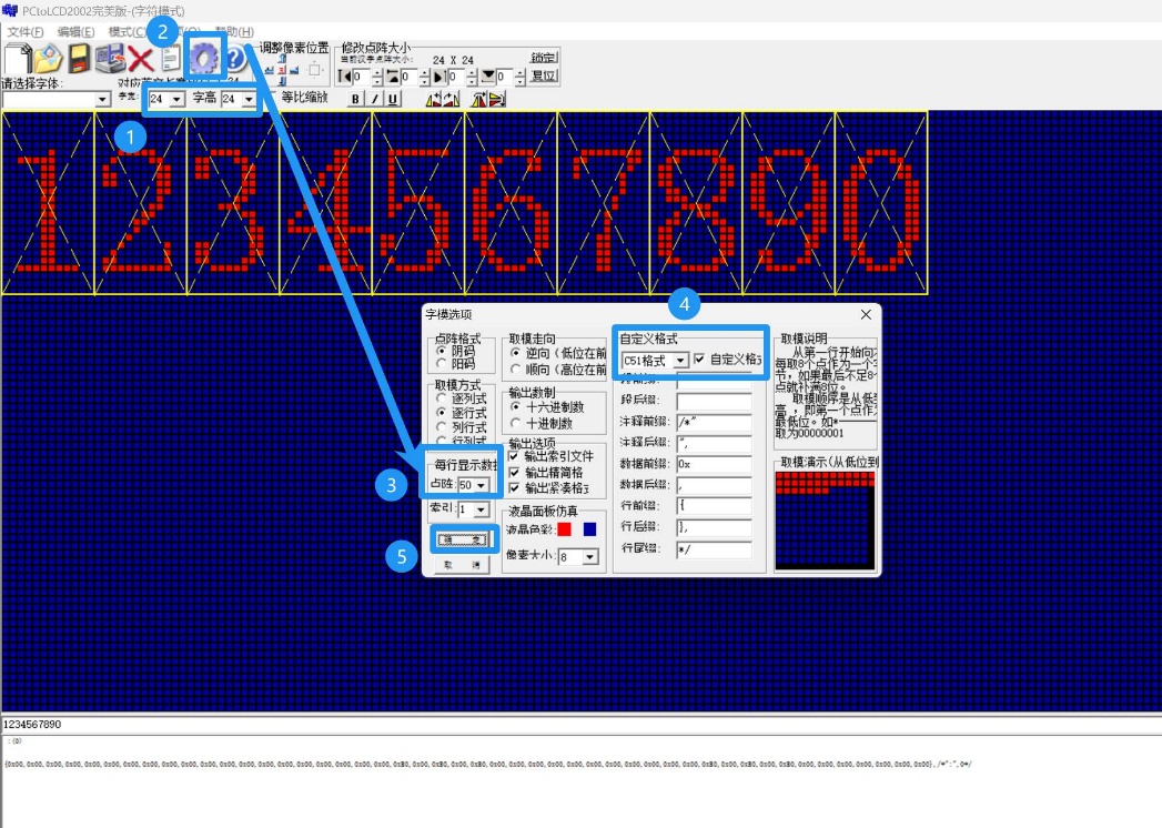 使用的是PctoLCD2002这个小软件,需要设置一下,1那里是字号,3那里的点阵会影响数据的分行,可以修改看看导出的效果。