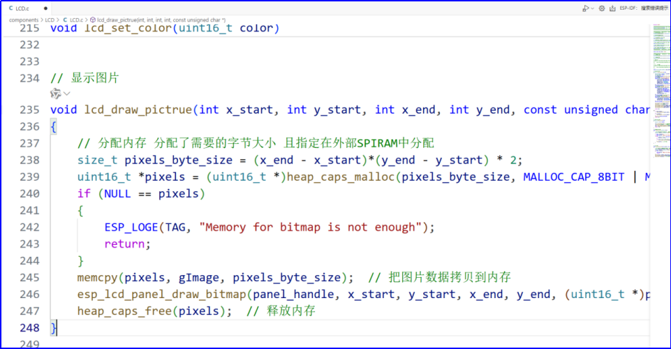 关键提醒:内存分配时需指定MALLOC_CAP_SPIRAM,避免分配到片内内存: