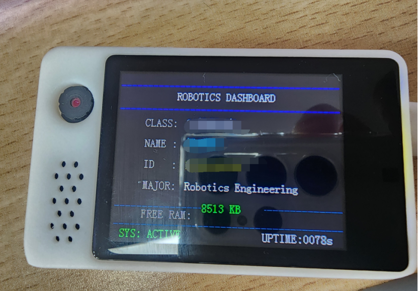 C void lcd_show_info(esp_lcd_panel_handle_t panel) { lcd_fill_screen(panel, 0xE6E6); // 浅灰色背景 // 显示大字体班级 lcd_show_hz_30(panel, 20, 20, "机器人工程2班", 0xFF00, 0xE6E6); // 30×30大字体 // 显示学号和姓名 lcd_show_string(panel, 20, 80, "学号:20250904001 姓名:张三", 0x0000, 0xE6E6); // 显示装饰图片 lcd_show_image(panel, 200, 20, gImage_robot); } |