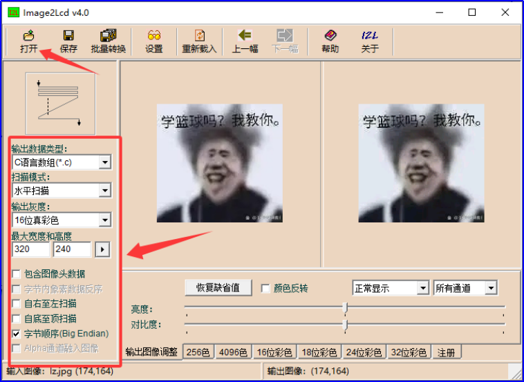 - 用Image2Lcd v4.0打开图片,设置:输出C数组、16位真彩色、水平扫描、包含图像头;