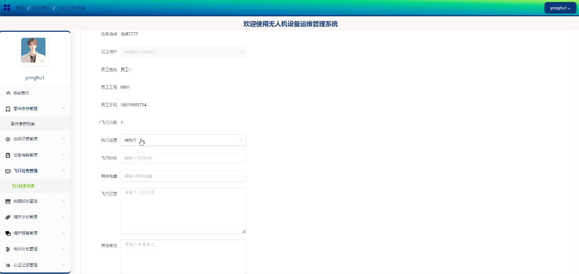 - 飞行任务管理:员工用户可管理自己的飞行任务,负责更新和记录飞行情况,提供故障报告操作。