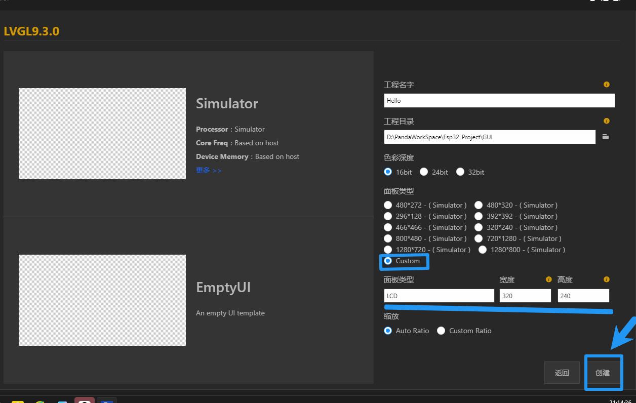 完善项目信息,老样子,最好还是不要选择中文路径。这里的custom就是自定义虚拟的屏幕尺寸,按照自己的规格选就可以了。