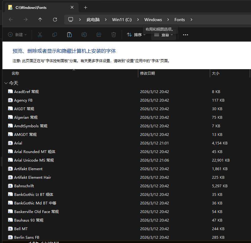 如果要使用自己喜欢的字体,要到这个目录去复制出来到单独的目录,因为软件无法直接访问这个文件夹