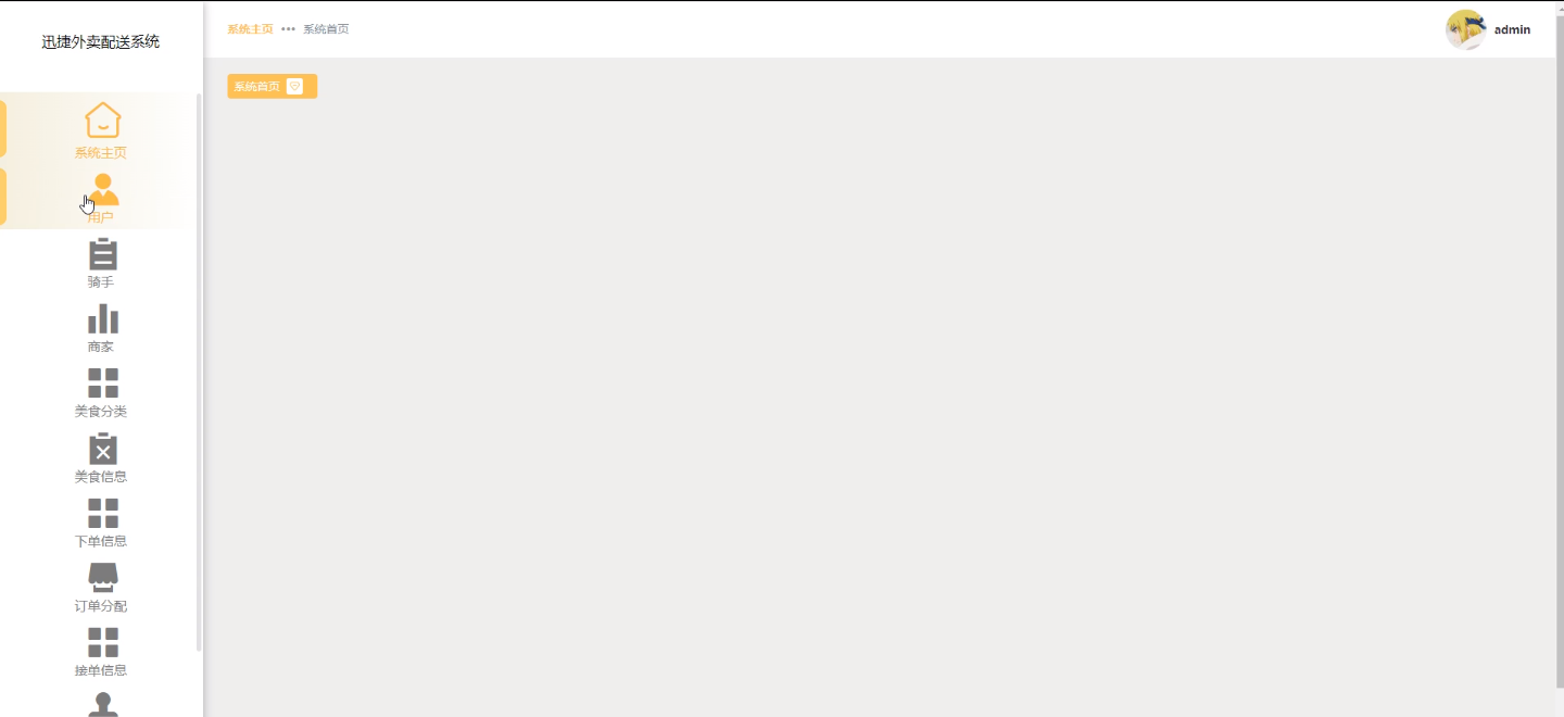 (1)系统主页:可以查看系统用户、美食信息、下单信息、订单分配、接单信息、配送订单等功能。