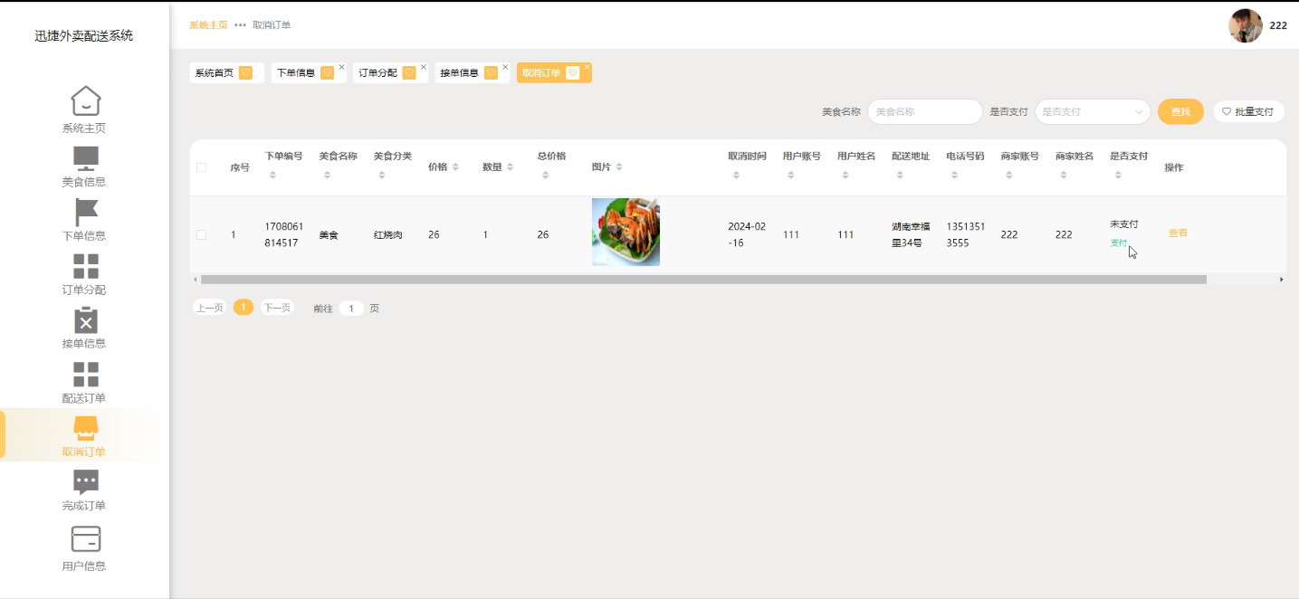 (4)取消订单:商家用户可查看前台用户已取消订单信息,可进行查询或删除等操作。