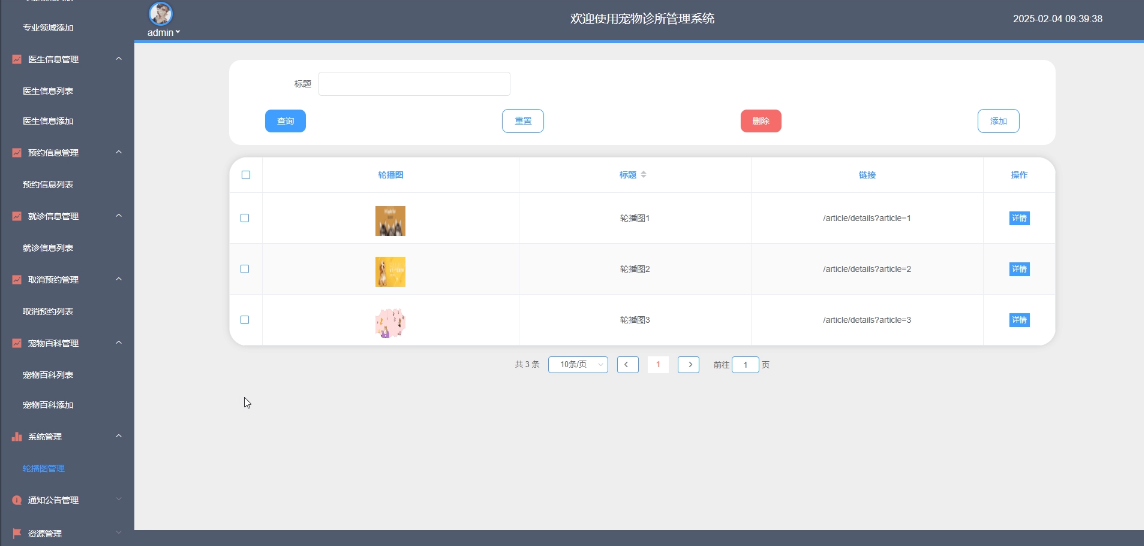 - 系统管理:管理员可管理系统首页的轮播图信息,提供搜索功能,支持上传、删除、更新轮播图内容,可添加图片链接信息。