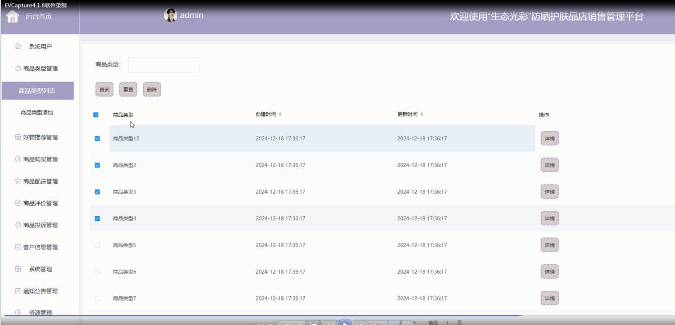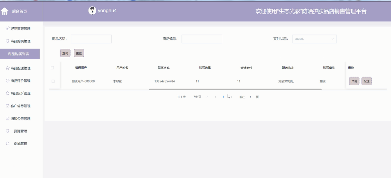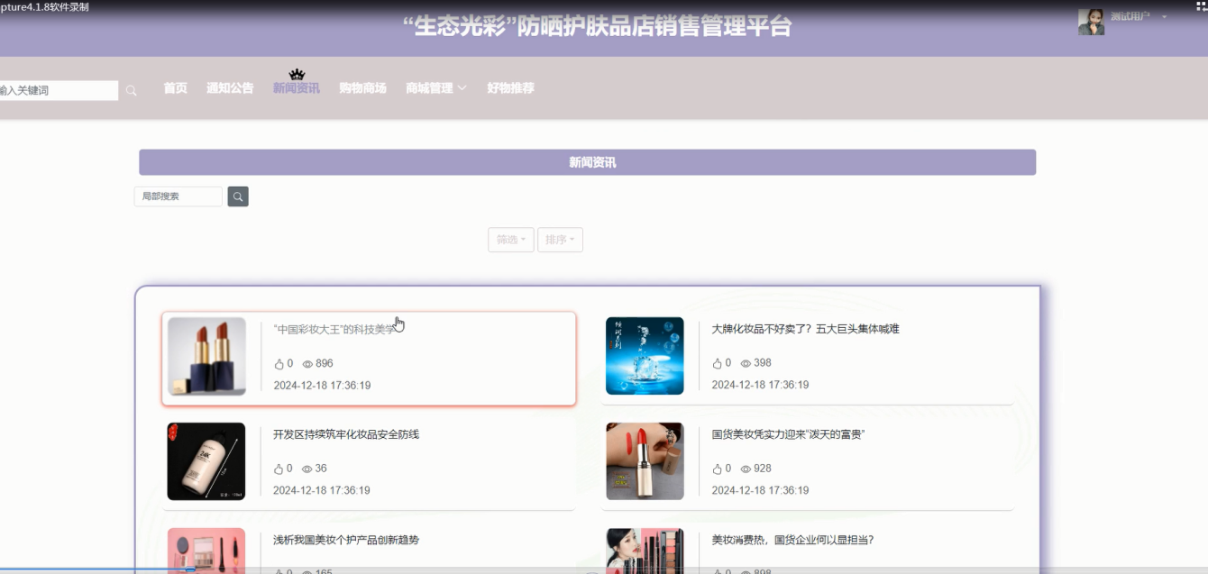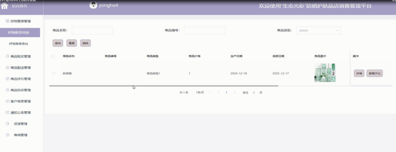 随着护肤品市场的快速发展,消费者对防晒护肤产品的需求日益增加。为满足这一市场需求,本文设计并实现了一款基于Spring Boot框架的“生态光彩”防晒护肤品店销售管理平台。该平台旨在为用户提供便捷的购物体验,同时为商家提供高效的管理工具。