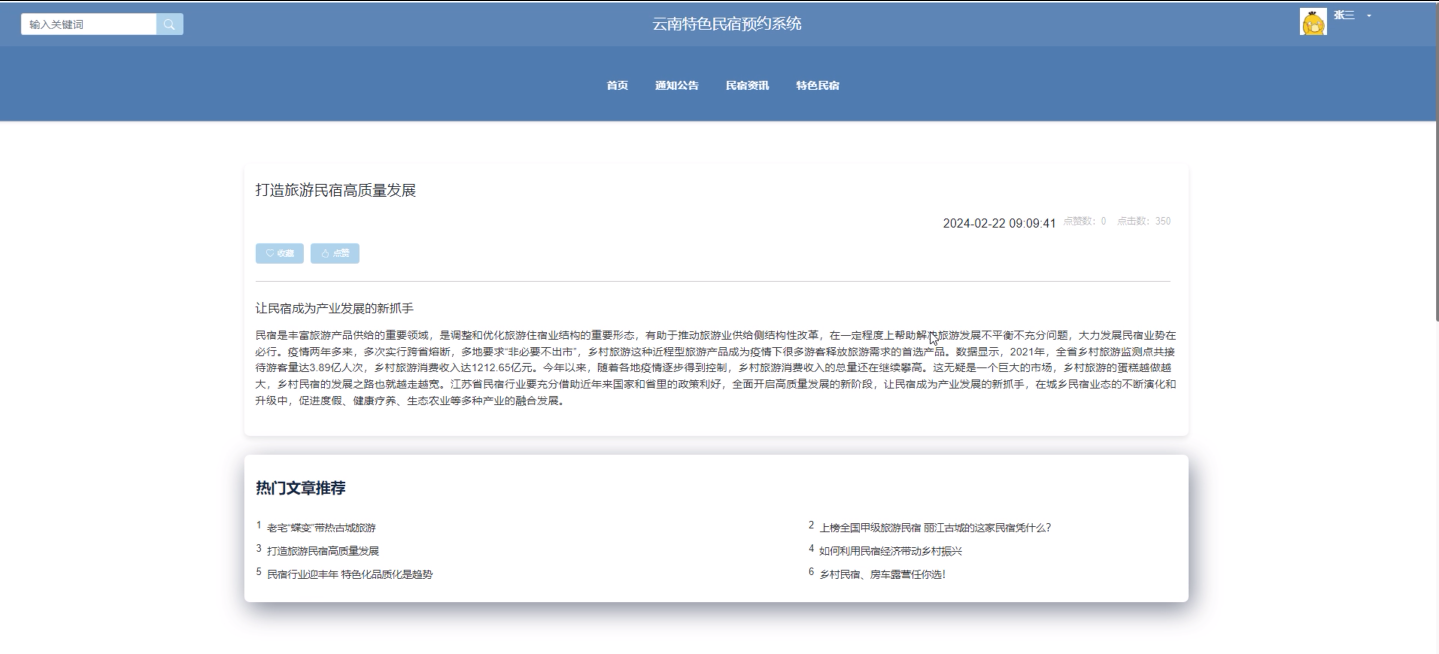 民宿资讯:用户可在此页面查看管理员发布的资讯信息,对喜欢的资讯信息可进行点赞、收藏和评论操作,界面如下图所示。