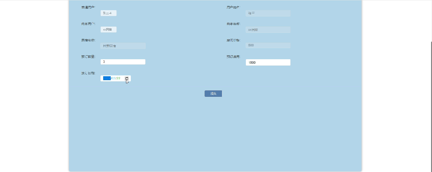 民宿预定:用户可以通过系统预订民宿,包括选择日期、数量等,方便快捷地安排入住。界面如下图所示。