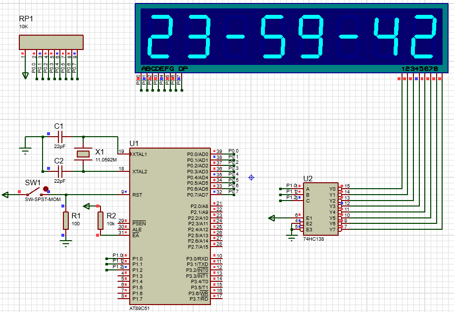 - 74HC138译码器位选: - P1.0 → A - P1.1 → B - P1.2 → C