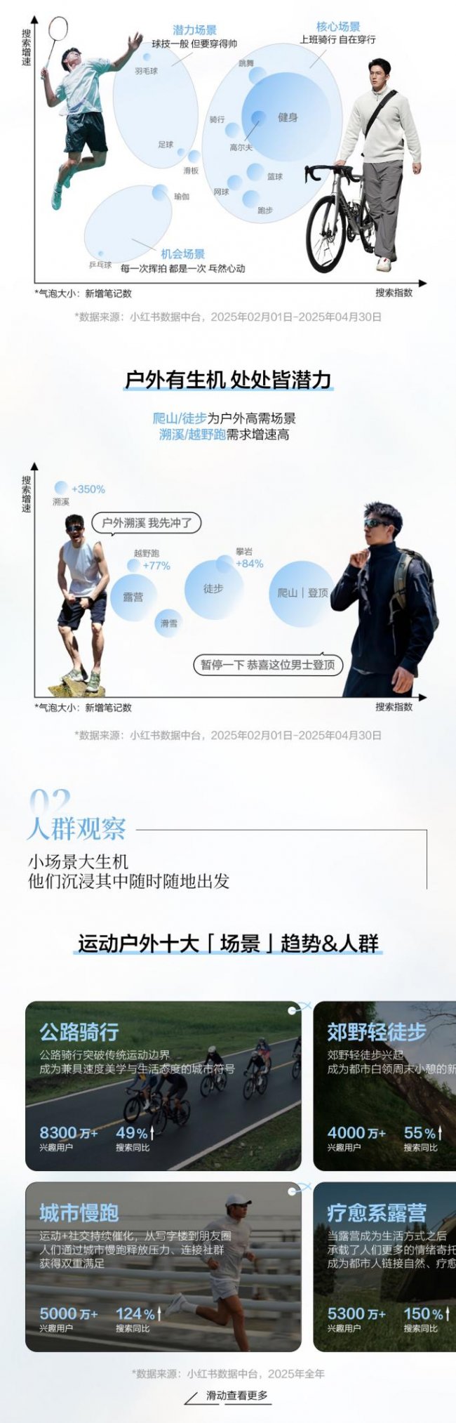 依托小红书社区沉淀的海量真实笔记与精准搜索数据,站内男装品牌的春上新风潮正经历一场从产品种草到场景驱动的变迁。在这里,场景是激发用户共鸣、建立深度信任、并最终促成转化的核心引擎,品牌通过定位春日露营、都市通勤、户外骑行等具体生活场景,将新品自然融入真实需求与向往之中,让种草点位更加精准可触,真正实现以内容力驱动生意增长。