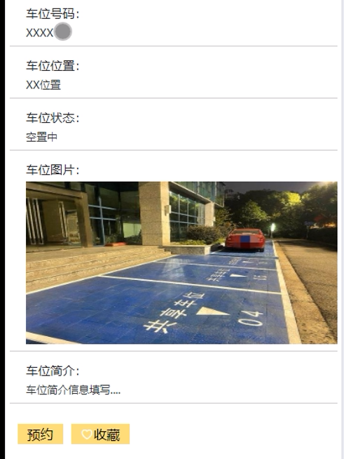 在小区车位页面,用户可以轻松获取有关车位的详细信息,还可以通过车位号码进行快速搜索,同时还可以进行预约、收藏等功能,如图5-6所示。