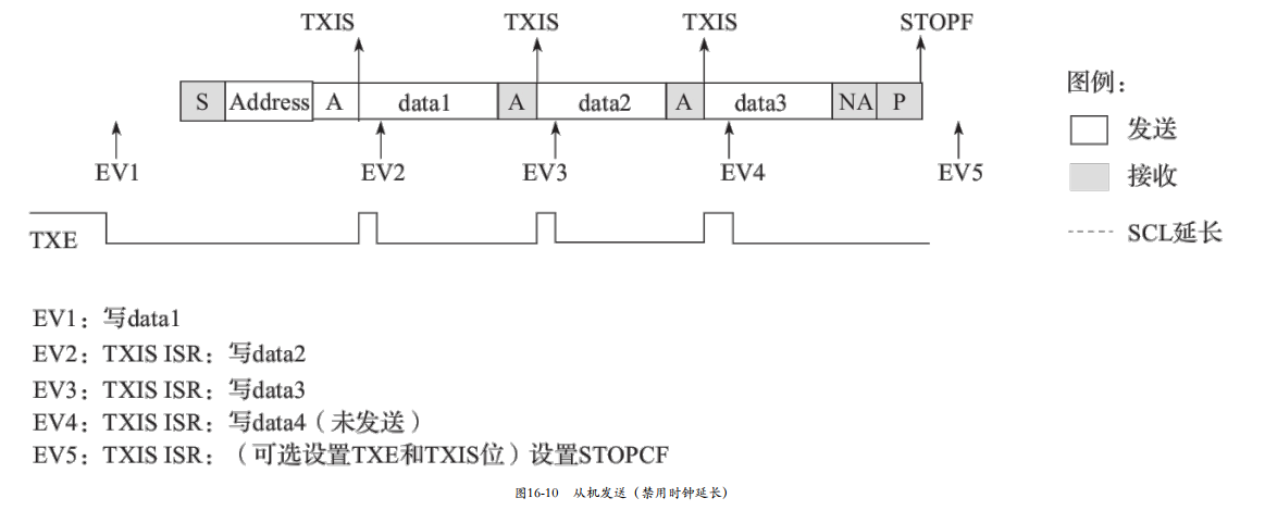 在禁用时钟延长的情况下从机发送数据的过程如图16-10所示。在从机完成初始化且没有被寻址之前,软件将待发送的数据字节1写入TXDR寄存器中(EV1)。当从机被寻址后自动发送应答位并转为从机发送模式,保存在TXDR寄存器中的数据字节1转移至移位寄存器中,此时TXE位和TXIS位均置位,表明TXDR为空且第一字节已经开始发送。在字节1发送过程中,软件再次将字节2写入TXDR寄存器中(EV2),每收到一个应答位,TXE位和TXIS位都将置位,当从机接收到来自主机的非应答信号后,先前已经写入到TXDR寄存器中的数据将不再保存至移位寄存器,TXE位和TXIS位也将不会置位,本次数据传输在主机产生的停止条件后结束。
