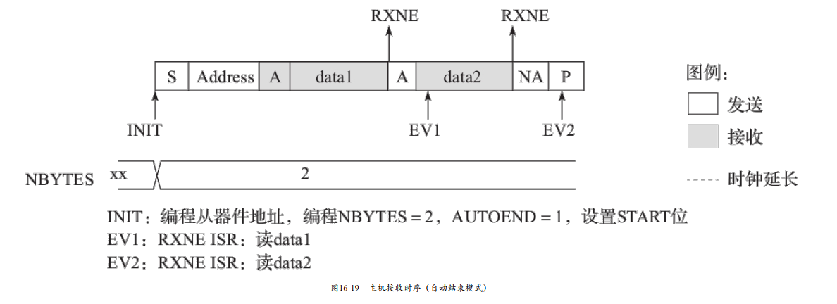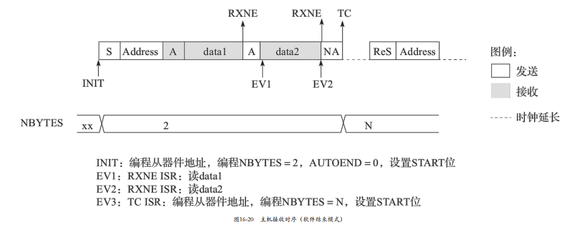 软件结束模式下接收数据的过程与自动结束模式大体相同,只是在接收到从机发送的最后一字节后,在RXNE位置位的同时,传输完成标志位TC也会置位,这时可以软件决定下一步是发送重复起始条件重启数据传输还是发送停止条件结束本次传输,很明显图16-20中选择的是前者。