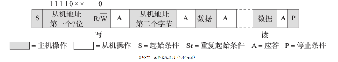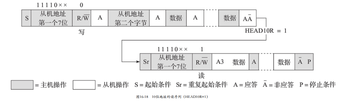 当使用10位地址时,寻址字节由7位地址时的1个变为2个,10位地址的读序列如下。