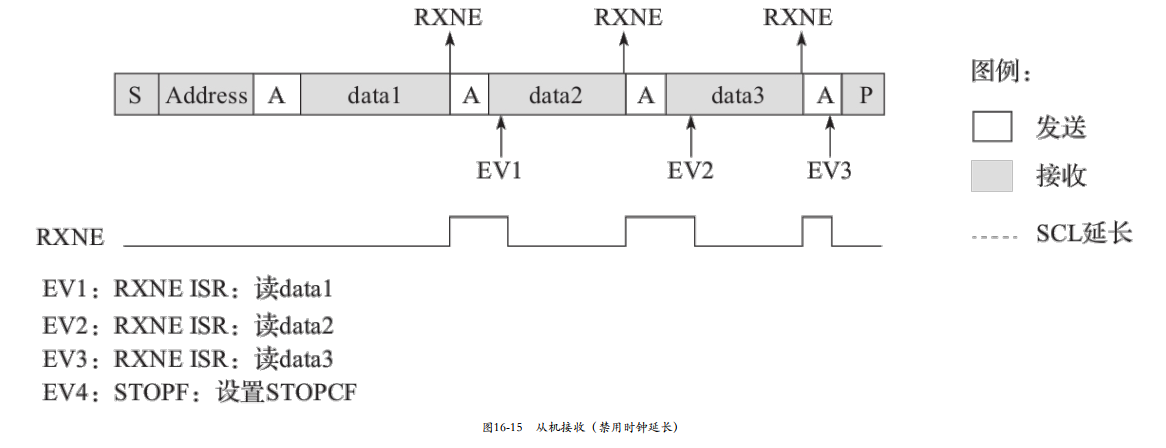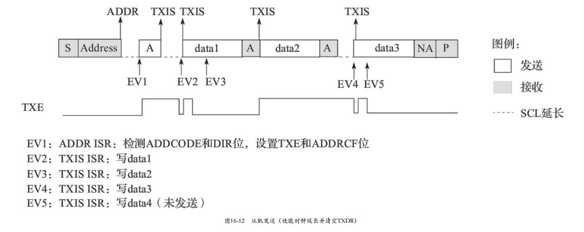 使能时钟延长的从机发送过程如图16-11所示。在从机没有被寻址之前,发送数据1已经写入TXDR寄存器中,当从机被寻址后ADDR标志位置1,此时时钟延长开启以等待从机做相应的软件处理,之后软件置位ADDRCF位以清除ADDR标志(EV1)。该清除操作将使从机自发送一个应答位,表示从机已准备好进行下一步操作,同时将写入TXDR寄存器中的字节1移送至移位寄存器中开始发送。当字节2发送完毕并接收到来处主机的应答位后,待发送的字节3未及时写入TXDR中,这时从机又会再次拉低SCL线,直至将字节3写入TXDR中。同样当从机收到非应答信号时,TXIS位不再置位且保存至TXDR寄存器中的字节4也不能被发送。