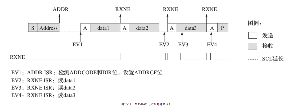 在允许时钟延长的情况下,从机接收数据的过程如图16-14所示。当ADDR位置位后,时钟延长被使能,这时从机可以读取I2C_ISR寄存器的ADDCODE位和DIR位用于相关处理,之后软件设置I2C_ICR寄存器的ADDRCF位以清除ADDR位,从机自动转入接收状态。从机每接收到一个数据字节,RXNE位都会置位,读取RXDR寄存器可以清除RXNE位,当接收到的数据没有及时读取时,从机时钟延长会使能。