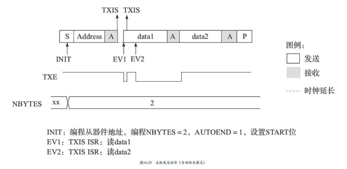 在自动结束模式下,主机发送两字节的过程如图16-23所示。主机在初始化过程中,已经完成了对从机地址、传送的字节数(编程为2字节)的设置,并将I2C模块设置为自动结束模式。之后主机发送一个起始条件和从机地址以启动本次数据传输,从机在成功被寻址后发送一个应答位,主机接收到此应答位后将TXIS位置位。由于此时TXDR寄存器中并没有写入待发送的数据,所以主机将SCL线拉低以等待数据,直至软件将数据写入TXDR寄存器后,SCL线上的时钟延长随即停止,TXIS位清除。写入TXDR寄存器中的数据立即转移至移位寄存器中进行发送,同时TXIS位将会再次置位。当两字节发送完毕后,主机发送一个停止条件结束本次数据传输。