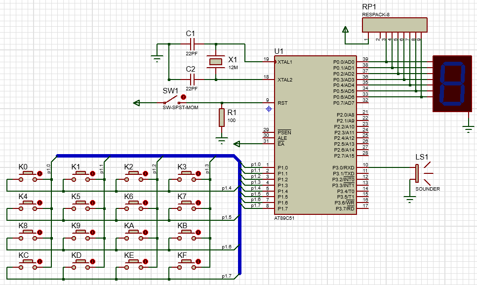 本项目基于STC89C51单片机,采用线翻转法实现4×4矩阵按键的按键识别功能,将按键对应的键值(0~F)通过共阴极数码管实时显示,同时配合无源蜂鸣器实现按键提示音。
