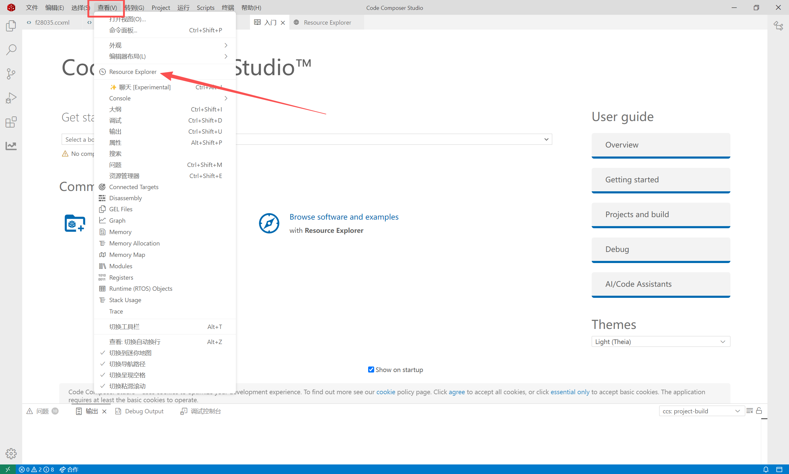 步骤1:进入CCS主界面,点击菜单栏「查看」→「Resource Explorer」;