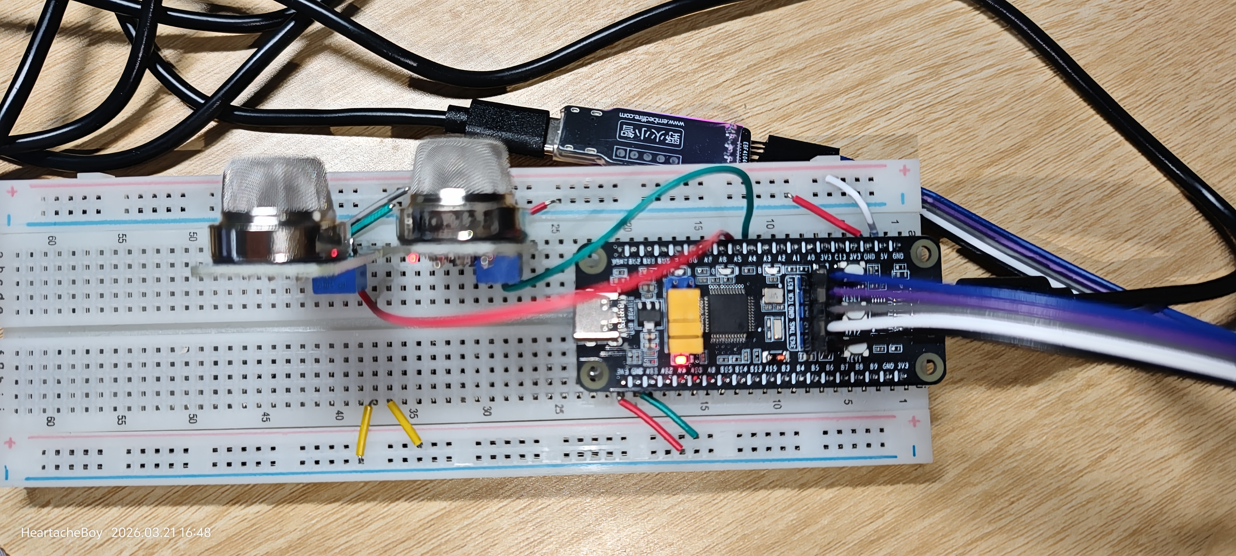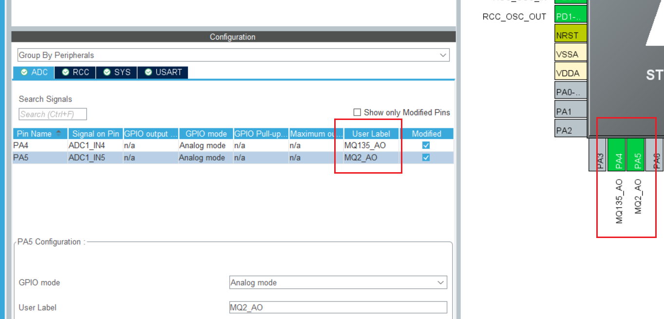 然后从上方横排给两个模块接 5V 和 GND, 再用两个单独线将模块的 AO 引脚与 ADC 输入引脚相连接.
