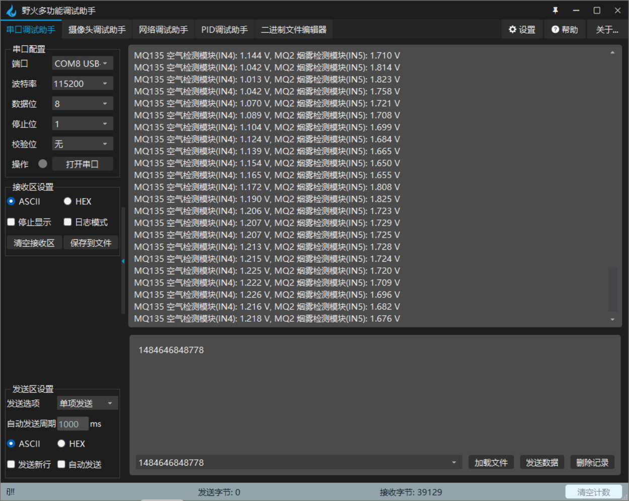 printf("MQ135 空气检测模块(IN4): %.3f V, MQ2 烟雾检测模块(IN5): %.3f V \r\n",