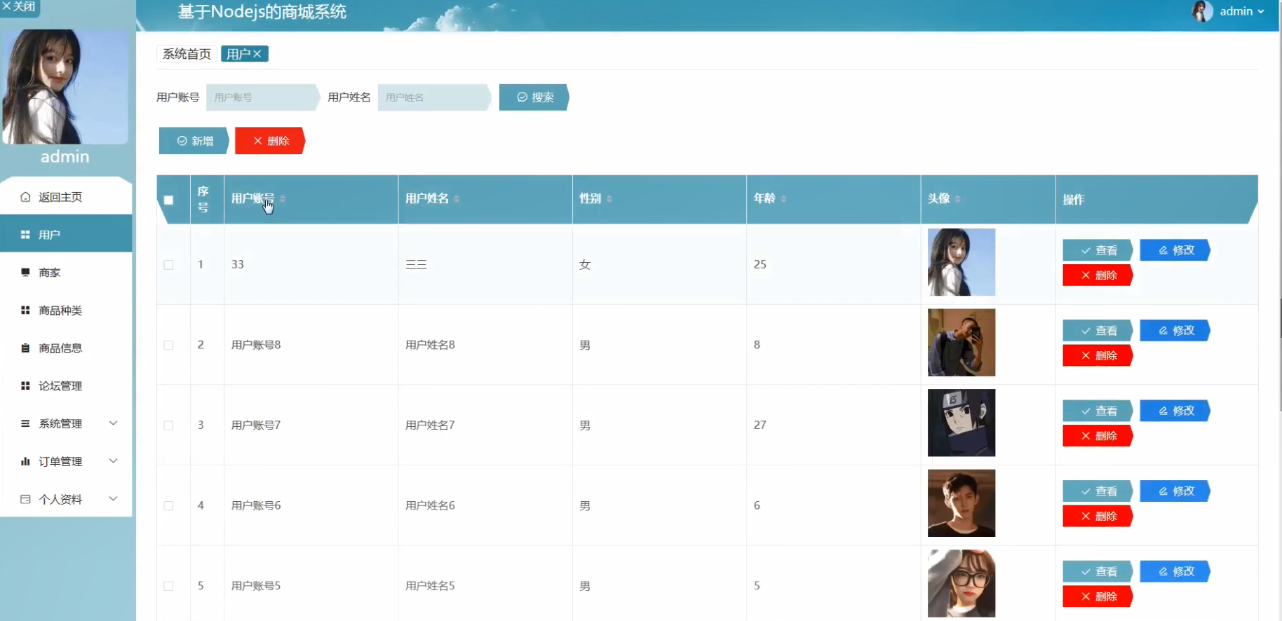 管理员可以在用户界面进行用户信息的管理,包括增删改查操作,可以根据用户账号、用户姓名,搜索到相应的用户信息,并进行增删改查操作。该模块实现的界面如图5.11所示: