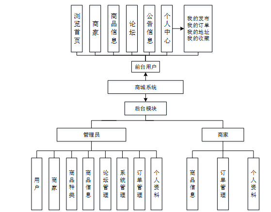 用户管理模块的实现,能够完成用户的登录注册,购买商品,修改个人信息。商家管理模块的实现,能够完成商家的登录注册,添加商品、发货,修改个人信息。管理员管理模块的实现,能够完成商品信息等功能。功能结构图,如图4.1所示。