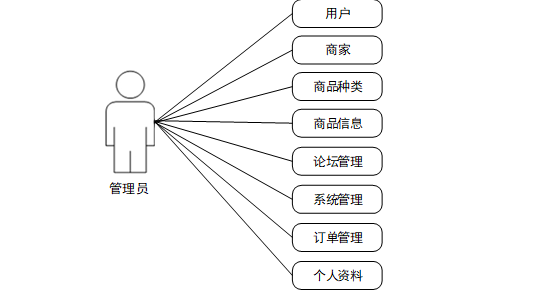 (3)管理员的权限是最高的,可以对系统所在功能进行查看,修改和删除,包括用户、商家功能。管理员用例如下: