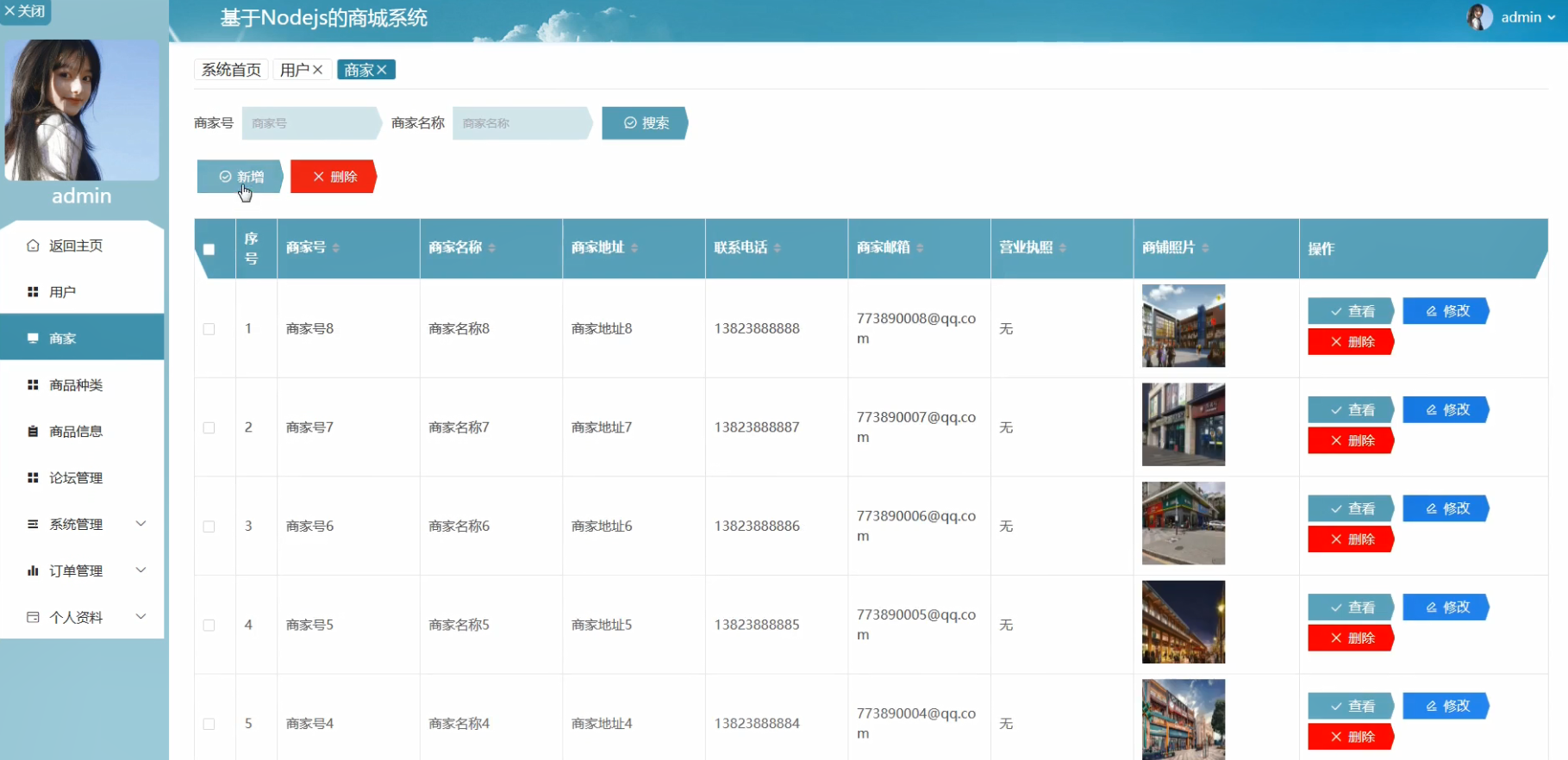 管理员可以在商家界面进行商家信息的管理,包括增删改查操作,可以根据商家号、商家名称,搜索到相应的商家信息,并进行增删改查操作。该模块实现的界面如图5.12所示: