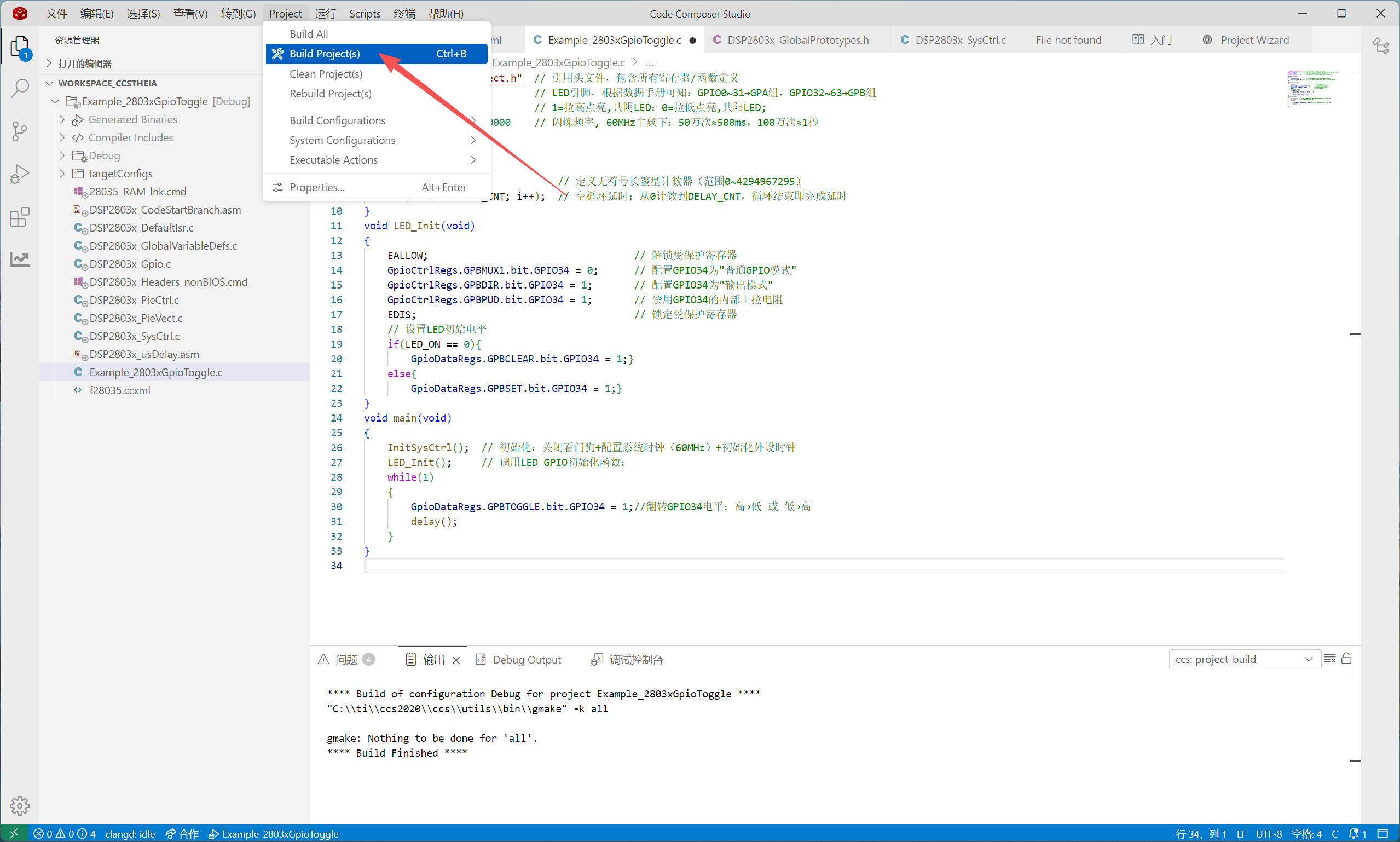 2、找到CCS文件目录,查找下面路径[ti>CCs2020>C2000Ware_6_00_01_00>device_support>f2803x>c28>examples],找到F28035支持包位置,选择适合的例程并打开;在左侧资源管理器展开已打开的工程,找到工程名.c文件(这个就是工程main.c文件,后续代码编写在此完成);3、选择工程,右键选择 【Build Project】编译工程,在输