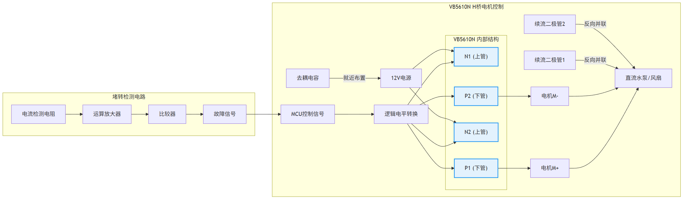 针对电机换向噪声,VB5610N的电源引脚需就近布置去耦电容(如100nF + 10μF)。水泵电机线可采用屏蔽线或双绞线。整体上,将数字控制部分与功率驱动部分在PCB上进行区域分隔,并采用单点接地策略。