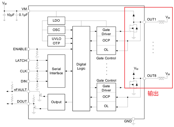 SGM42406属于低侧驱动芯片,所谓的低侧驱动,即指驱动芯片被放置在负载和地(GND)之间,而负载的另一端直接连接到电源正极,并通过控制芯片对地的通断,来控制负载的电源回路,该芯片的功能框图如下所示: