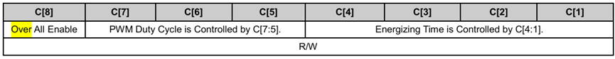 芯片通过设置控制寄存器来配置通电时间和输出PWM占空比,驱动电机时会用到: