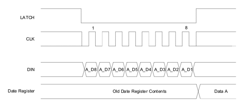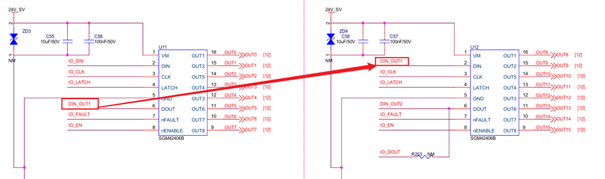 即级联的各个芯片共用LATCH,CLK,前一级芯片的DOUT引脚连接到下一级芯片的DIN引脚。