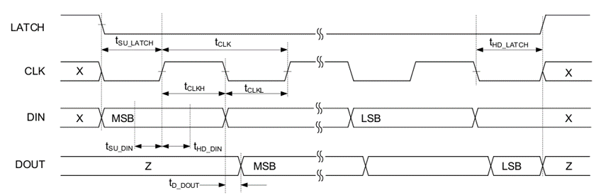 SGM42406与MCU之间通过4线串行通信,通信时序可以参考SPI总线实现,可以用硬件SPI,也可以用软件SPI实现功能,即LATCH引脚对应CS信号,CLK对应CLOCK信号,DIN对应MOSI信号,DOUT对应MISO信号,通信时序如下图所示: