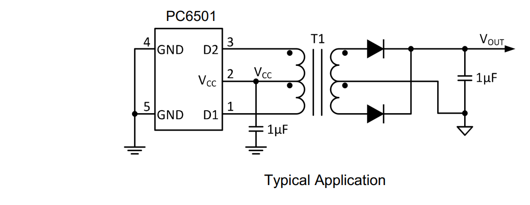 内部逻辑确保两个开关之间的“先断后通”操作。内部保护功能包括欠压锁定、热关断和输出电流限制。通过控制输出开关电压的斜率以及采用扩频时钟(直流电源供电,用于驱动低轮廓中心抽头变压器的初级绕组。次级绕组可根据变压器匝数比提供任何隔离电压。PC6501 由振荡器和随后的门极驱动电路组成,后者提供互补输出信号以驱动接地参考。)推挽式变压器驱动器,专为隔离接口应用中的小型化、隔离电源设计。)技术,实现了低噪